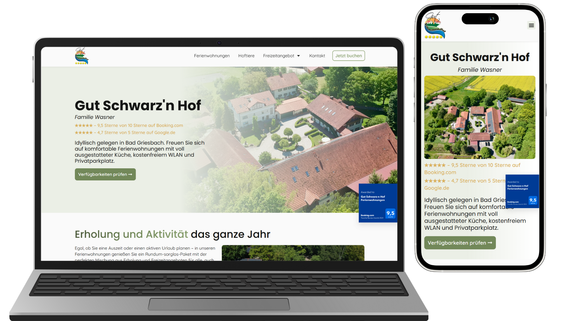 Die gesamte Website wird neben Desktop auch für Handy und Tablet optimiert. So können deine potenziellen Gäste über ihren bevorzugten Weg deine Website besuchen und ihren nächsten Aufenthalt buchen.